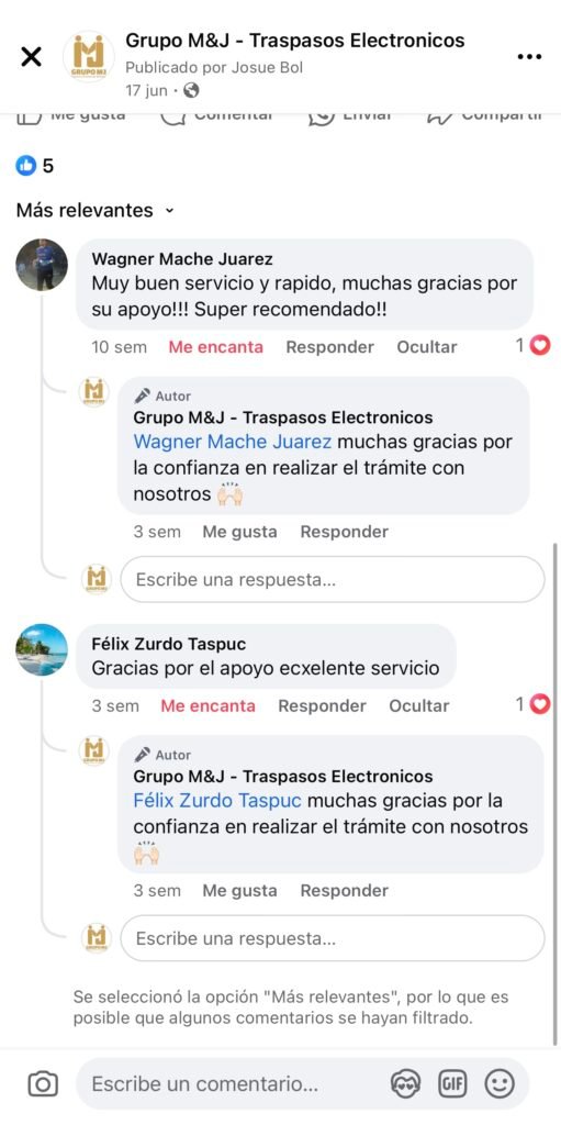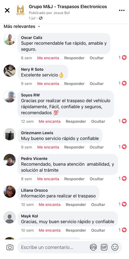 Descripcion del proceso: Para realizar el traspaso electronico, se puede aplicar si tu tienes la documentacion de forma digital, lo que seria titulo del vehiculo, tarjeta de circulacion, fotografias del DPI de vendedor y comprador. Es importante que el titular del vehiculo pueda realizar la autorizacion desde la agencia virtual de SAT sin ese apoyo no podriamos realizar el traspaso en 45 minutos.